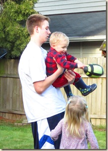 But my kids were watching the big guys covertly, and Wesley was hooked when he saw them play ball. I will say that though the boys are giants, they are gentle giants, and not only let my three play football with them, but taught them how to tackle. Well, okay, they pretended that Kyla and Piper’s efforts actually made them fall. And then threw Wes on top.