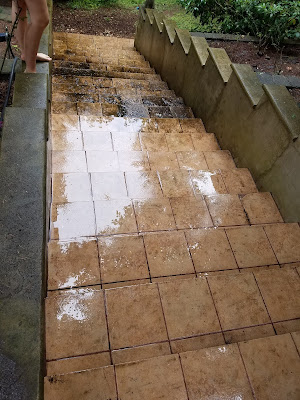Wesley wanted to earn more money, as he is eyeing lots of expensive ($20-40) toys. When he begged for extra jobs, I gave him a doozy! Pressure washing the back stairs is way wetter and dirtier than regular pressure washing, as the stairs love to back splash you in the face at nearly angle. But well worth (Wesley's) effort!
